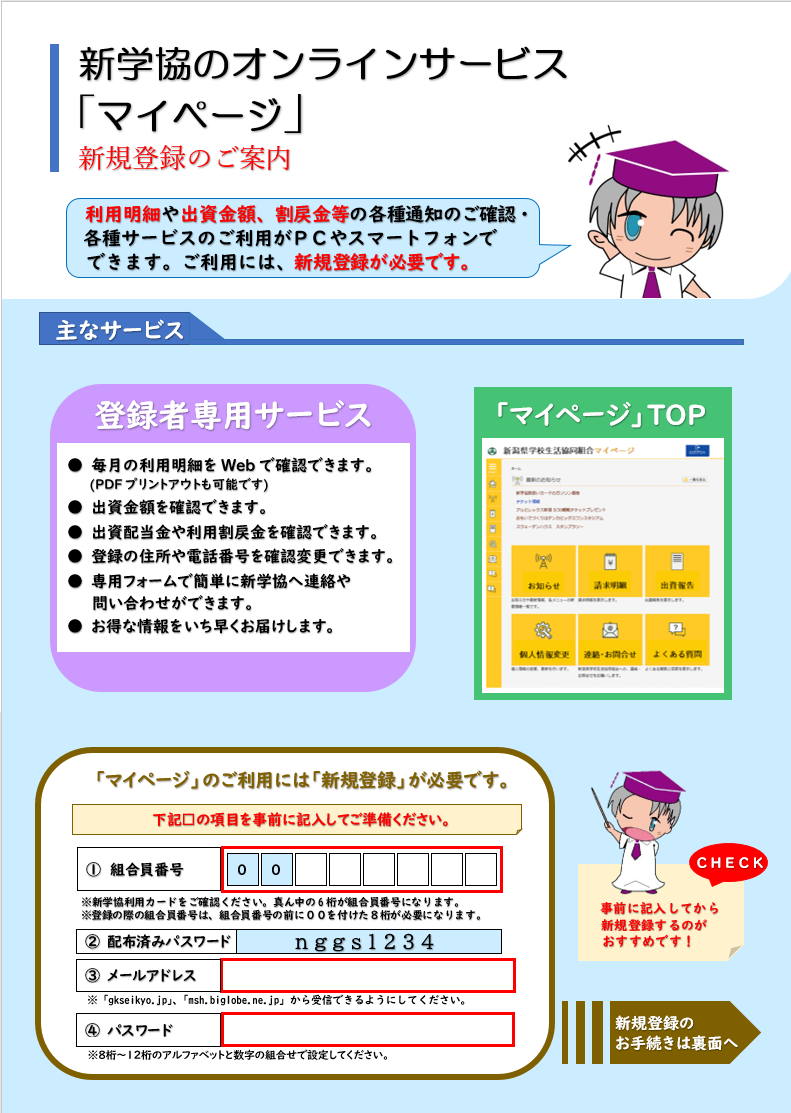 • 新学協へご加入の方は、「新学協加入申込書」を提出し、新学協で出資金の入金を確認後、マイページ登録に必要な案内を送付いたします。内容を確認しご登録ください。